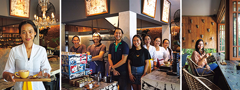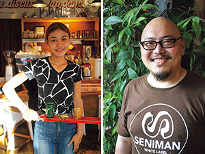 左から:フラット・ホワイトを運ぶスタッフのアリットさん。コーヒーには小菓子と水が付く。/マネージャーのレオ・ウィリーさん。ホテルマンから転身してきた。