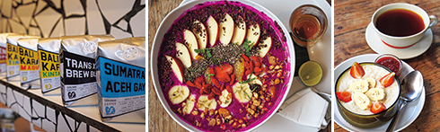 左から:バリ島キンタマーニ、スマトラ島アチェ、ジャワ、フローレス等々、インドネシア各地のコーヒー豆が並ぶ様は圧巻。/フルーツがふんだんに入ったミューズリー。/スニマン・スタイルのオートミール・ポリッジ。