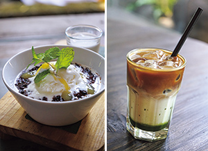 ココナツミルクに浸した黒米のポリッジにアイスクリームを浮かべたブブール・インジン。/アイス・エスプレッソ・抹茶。