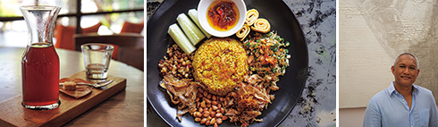 左から:マニュアル・ブリューは4種。こちらはサイフォンで淹れたもの。/オーナーの母親のレシピを生かしたナシ・クニン。/オーナーのハルタワン氏。民族的なアートを主に収集。