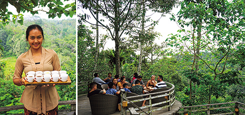 左から:テラスの縁に立つスタッフのスマワティさん。背後は見渡す限りのグリーン!/熱帯雨林に張り出したテラス席。この辺りは標高が700mほどあって、平地よりもかなり涼しい。