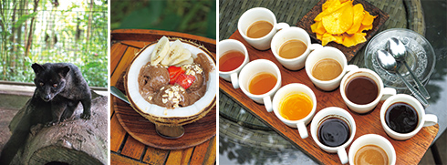 左から:ジャコウネコ。/アイスクリームはココナツの実に盛られて登場。カカオも自社で生産している。/フレーバー・コーヒーなど10種類の飲み物が試飲できるセット。