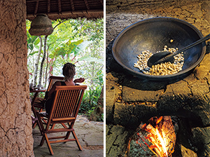 左から:開放感は全てのテーブルに共通する。/炭火の上でコーヒー豆を焙煎するデモンストレーション。ガイド付きで敷地内を見学するツアーもある。