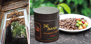 左から:バリ伝統の木彫が施された堂々たる門。ここから先は表の喧騒とは別世界という造りがいかにもバリらしい。/ジャコウネコの習性を使って作られるコピ・ルワックはこのコーヒー農園の目玉。