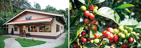 左から:焙煎やカッピング、コーヒー豆の梱包と販売が行われる「コーヒー・ラボ」。農園ツアーはここからスタート。/12月上旬、赤く染まり始めたコーヒーの実が、収穫期の訪れを告げる。