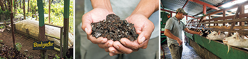 左から:学生の提案で設置したバイオダイジェスターで生ゴミからメタンガス燃料をつくる。/コーヒーのカス、皮、実と家畜の糞からつくったミミズ堆肥。/施設で消費する乳製品をつくるために飼育するヤギ。かつてモンテベルデは酪農が盛んだった。