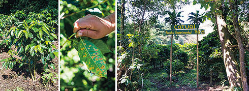 左から:さび病に強いオバタ種の栽培に取り組む。/無農薬だとさび病の被害が著しい。/木々で囲み隔離した完全無農薬の実験農場。