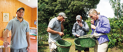 左から:写真のセルヒオ・バリオス・マイレナさん含む3人がガイドを務める。/自ら摘み取ったコーヒーの実を試食。