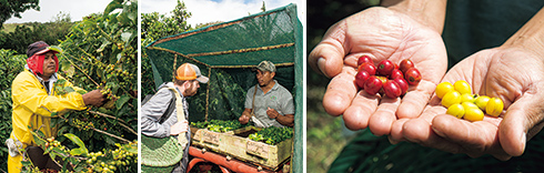 左から:さすが! ピッカーの収穫は手際良く速い。/苗の畑への植え替えについて説明。写真の品種はカティグア。/色鮮やかなレッド・カトゥアイとイエロー・カトゥアイのコーヒーの実。