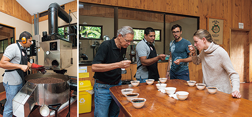 左から:生産されるコーヒー生豆の4割を輸出。残り6割のうち多くは農園で焙煎され、農園とカフェで販売されている。/ツアーの最後に焙煎人の案内でカッピングを体験。