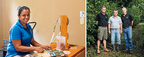 左から:焙煎したばかりのコーヒーをパッキング。新型コロナウイルスの流行を機にコーヒー豆のインターネット販売を検討している。/経営者の3人。左から教育担当のギジェルモ・バルガスさん、生産担当のセサル・サンタマリアさん、経営担当のホセ・ルイス・バルガスさん。