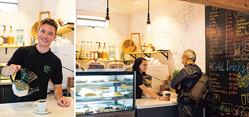 左から:コスタリカの陶製コーヒーメーカー「バンドーラ」を握るバリスタ。/明るい店内にスタッフの仕事ぶりが映える。