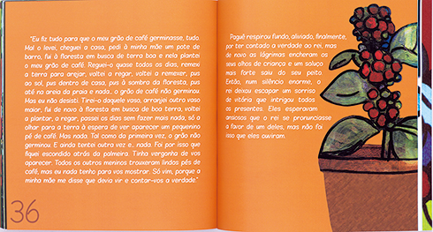 中国の民話『The Empty Pot』をもとに、場面をプリンシペ島に移して描かれた物語。島の語り部が子どもたちに昔話を語る体裁で、かつての島の王様がコーヒー農園の後継者をその時代の子どもたちに求める話が展開される。ポルトガル人に発見されるまでサントメ島とプリンシペ島はいずれも無人島だったというのが通説だが、それ以前にアフリカ大陸との往来があったという説もある。同説もまた本書の構想の源の一つだ。テレーザ・ボンドーザによる手書きのイラストが掲載された全44ページ。