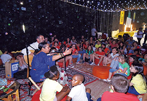左:島の昔話を語る老人カシンペンベ。中国の昔話にはないこの語り部を登場させることで、かつて文字を持たなかったサハラ以南のアフリカの口頭伝承の世界が表現された。