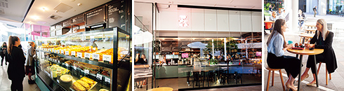 左から:ズラリとショーケースに並ぶドーナツ、ペストリー、サンドイッチ類は壮観。/店が入っているQV1ビルには西オーストラリア州の基幹産業である鉱業や法律関係のオフィスが多く入る。/ビジネスミーティングをするキャリアウーマン。パースっ子気質は「保守的」とされ、ここだと決めた店には通い続けるのだそう。