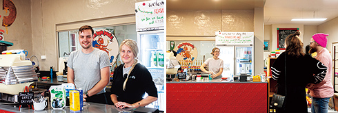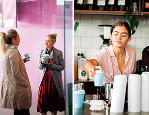 左から:常連客とのやりとりが楽しい、とスタッフは言う。/カウンターの背後には、再利用可能カップの使用によって廃棄を免れた紙製カップの数が掲げられている。
