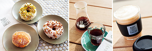 左から:カラフルなドーナツ。写真上から時計回りにローズウォーター・ピスタチオ、レモン・メイプル・ピーカン、塩キャラメル。/シングル・オリジンのセット。添えられるシートには、コーヒーのデータが事細かに記されている。/テイクアウト用のタンブラー(大29.99AUD、小27.99AUD)。