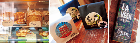 左から:ベーグルサンドイッチやペストリーは契約ベーカリーから。/グアテマラ・エスプレッソ(右)とオリジナルブレンドの「ヘリテージ」(左)。/店名は「緑」を表す造語。
