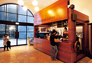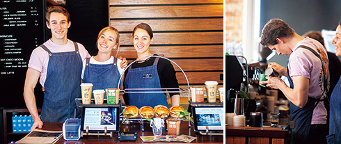 左から:揃いのデニムのエプロンを着けたスタッフ。今年7月、レインスクエアに2号店がオープンした。/ラテを作るスタッフ。エスプレッソ・マシーンは6つの抽出口を持ち、一度に12杯のエスプレッソをいれることができる。