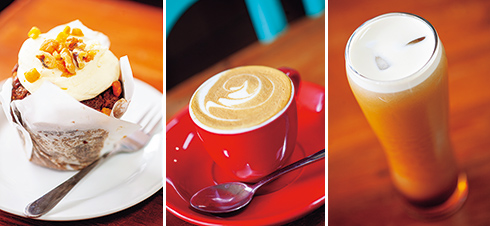 左から:キャロットケーキ。/フラット・ホワイト。その日によって使う豆や配合を変えている。/ドラフトビールに使うようなサーバーから注がれるコールドブリュー・コーヒー。