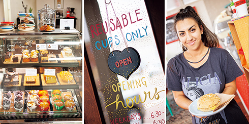 左から:スイーツは4つのサプライヤーから。菓子職人にとってはこの棚がポップアップ的な役割を果たす。/「繰り返し使えるカップのみ使用可」の断り書き。/ベーグルをサービスするスタッフ。