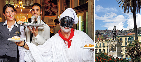 左から:「グラン・カッフェ・ガンブリヌス」のスタッフと客にアピールするプルチネッラ氏。/ナポリは古代ギリシャ人によって建てられた。