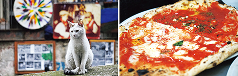 左から:スペイン地区で出会った猫。/もう一つのナポリ名物、ピッツァ。名店「ダ・ミケーレ」のマルゲリータとマリナーラのハーフ&ハーフ。