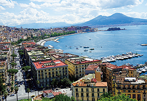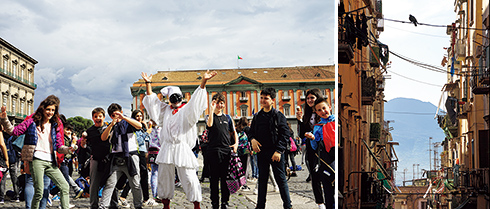 左から:サン・カルロ劇場前の広場で子供たちに囲まれるプルチネッラ氏。彼が現れると誰もが興奮し、場のエネルギーが高まる。/スペイン地区からヴェズビオ火山を望む。かつての「悪名」は鳴りを潜め、壁画アートが話題になる、B&Bが増えるなど、すっかり観光地になった。
