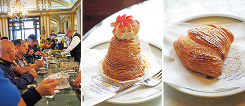 左から:「ガンブリヌス」のカウンター席。/オリジナル・スイーツの「ヴェズビオ」。噴火をリアルに(?)表現。/スフォリアテッラはナポリ発祥のスイーツ。層を成す薄いサクサク生地は芸術の領域!
