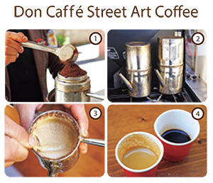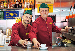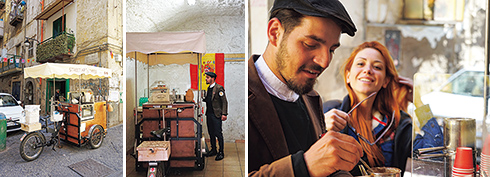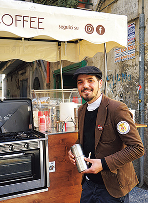 まったく、若者は困ったもんじゃ。さあ、降りてきたぞ。やあ、ジュゼッペ、早速支度して、わしらにとびきりのコーヒーをいれてくれんか。ジュゼッペ・スキファーノは25歳、これまで左官、バーテンダー、木工職人とあれこれやってきたが、ずっとコーヒーで身を立てたいという夢があった。1万5000ユーロを調達して屋台のコーヒースタンドを特注し、開業したのは半年前のこと。その名も「ドン・カフェ ストリート・アート・コーヒー」。洒落とるじゃろ?