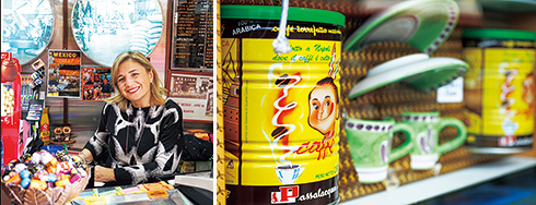 左から:モニカ・スガンバーティさん。レジ周りの雑多な雰囲気がまたナポリらしい。/先住民ぽいいでたちの女の子がトレードマーク。実在のメキシコとはあくまでも無関係。