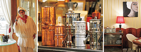 左から:プルチネッラ氏を演じてもらった俳優のアンジェロ・ヤンネッリさん。小学校や少年院で、子供たち相手に訓話的な話を演じることも。/ククメッラのコレクション。素材もサイズも色々。大きなもので6〜8杯のコーヒーをいれられる。/「グラン・カッフェ・ラ・カフェティエラ」のテーブル席。