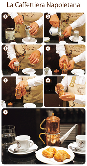 ああそうだ、ジュゼッペ、わしには砂糖をたっぷりといれたやつを頼むぞ。彼のコーヒーのいれ方はククメッラというポットを使う、19世紀からのナポリ伝統の方法なんじゃ。上下2つに分かれたアルミ製ポット(ククメッラ)の片方に熱湯をいれ、中間部分のフィルター皿に粗く挽いたコーヒー豆を入れる。2つをドッキングさせ、くるりとひっくり返すと抽出が始まるという寸法だ。イタリアのコーヒーといえばエスプレッソだと思っているかも知れんが、ナポリのコーヒーは本来、この方式でいれた一種のドリップコーヒーなんじゃよ。うーん、いい香りがしてきたわい。こら、ジュゼッペ、客の女の子とイチャイチャしてないで早くわしらにコーヒーを出さんか!