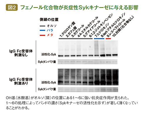 受容体に続いて、Syk(シック)というリン酸化酵素が炎症を進める。①クロロゲン酸、②カフェ酸、③カテコール、④4-エチルカテコール、⑤グアイアコール、⑥1,2-ジメトキシベンゼンは、炎症をほぼ完全に抑えてしまうことがわかった。(図2)