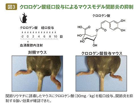 次に、血清誘導性関節炎、つまり関節リウマチに誘導したマウスに、コーヒーの主成分でありOH基(水酸基)がオルソ(隣)の位置にあるクロロゲン酸(30㎎/㎏)を経口投与する実験を行なった。すると、関節炎を抑制する強い効果が確認できた。(図3)