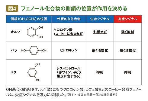 一連の実験データをまとめると図4のようになる。OH基をオルソにもつクロロゲン酸、カフェ酸などのコーヒー含有フェノールは、細胞の生存シグナルに影響せず、炎症シグナルを強力に抑制するので、将来的に炎症を抑える薬のシード(薬剤設計の基本的構造)として使われる可能性がある。
