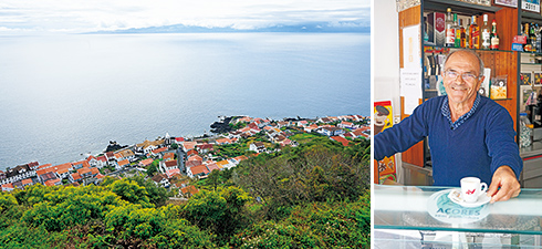左から:サンジョルジェ島の断崖の上からカリェタ村を見下ろす。目指すコーヒー農園のある村は、ここからほんの数キロ先にあるはずだったのだが……。/自慢の一杯を差し出すマヌエル・ヌネシュさん。ポルトガル領サンジョルジェ島の「カフェ・ヌネシュ」にて。
