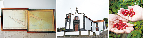 左から:サンジョルジェ島は地図を2枚に分けて表さねばならぬほど細長い。/白壁に玄武岩の黒がコントラストを成す、島独特の様式を持った教会。/ヌネシュさんの小さな農園で実ったコーヒーの実。
