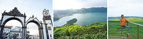 左から:サンミゲル島の観光名所、ポルタス・ダ・シダーデ。/セテ・シダーデス(7つの町)という名の湖には、王女と狩人の実らぬ恋の伝説がある。/展望台に立つリスボンからのツーリスト。