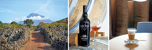 左から:ピコ山と火山岩のブドウ畑。/ピコ島産の酒精強化ワイン。/コンデンスミルク、ラテ、フォームが3層になった「ボム・ボム」は「セラ・バー」の人気メニュー。