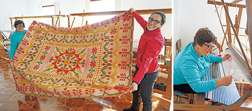 左から:「ハイポイント」と呼ばれる、毛足を長くする独特のスタイルで織られるベッドカバー。/マリア=アルジラさん。材料には羊毛と綿糸を使う。