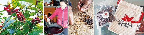 左から:枝の上では今年最初の色づきが始まっていた。/焙煎用のフライパン。直径が70cmほどある。/乾燥したコーヒーチェリーから生豆を取り出す。/焙煎した豆は100gで10ユーロ。ただし、販売は「カフェ・ヌネシュ」でのみ。島の街場でさえ売っていない。