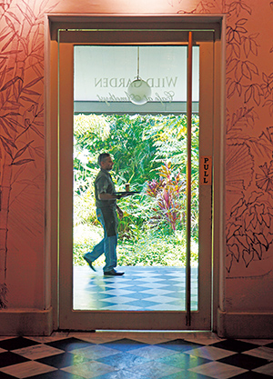 左から:午前中は涼しい風の通るテラス席がおすすめだ。/店の内部にはアンティーク品が随所に置かれ、サロン的な雰囲気。間接照明とガーデンからの光で程よい明るさ。/このゲートをくぐると熱帯植物のトンネルを天蓋にした小径が現れ、訪れた人を建物へと導く。都心の別世界を演出する心憎いレイアウトだ。