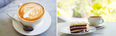 左から:カプチーノには3種の豆をブレンドしたエスプレッソを使用。/人気のケーキ、レッドベルベット。この店のスイーツは全体的に南インド標準からすると甘さ控えめ。