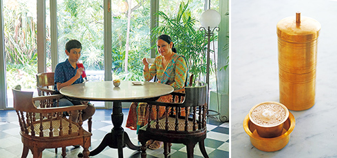 左から:買い物帰りに立ち寄った母子。インドは紅茶のイメージがあるが、コーヒーの歴史の方が200年以上も古い。特に南インドの人はコーヒーを好む。/インド式マドラスコーヒーをいれる器具。通常はアルミ製で350円程度で買えるが、こちらは真鍮製。
