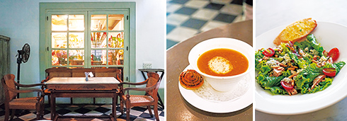 左から:フラワーショップ脇の特等席。/フランス人シェフが作るオニオンスープ。/松の実が香ばしいシーザー・チキンサラダ、アンチョビドレッシングで。