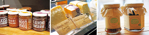 左から:ジャムももちろん100%自然素材。/チーズ・コーナー。ここからチーズを選んで、サンドイッチを注文することもできる。/ライム(左)とコリアンダー(右)のホームメイド無添加ピクルス。