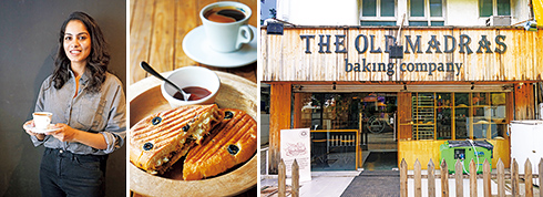 左から:PR担当のスウェタさん。彼女の個人的な好みはカプチーノとのこと。/ホット・チキンサンドはカリカリの生地の下から熱々のチーズがトロリと出てくる。スパイシーなディップがいかにも南インド的。/ベーカリーは街路樹が繁るショッピング・ストリートに面して立つ。