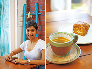 左から:ニヴルティさんの友人でマーケティングの仕事をしているプージャ・ゴヤルさんは常連客の一人。午後の気分転換に立ち寄ると言う。/ブロンディとハウスブレンドのエスプレッソ。