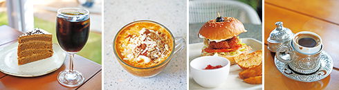 左から:南インド独特のプロセスで生産されるマラバール・モンスーンという豆を使って18時間かけて抽出するコールドブリューコーヒーとモカクリームケーキ。/ナッツやキャラメル、バニラで風味を足したフレーバード・カプチーノ。/ランチの人気メニュー、クリスピーチキンバーガー。/カルダモン入りのトルココーヒー。